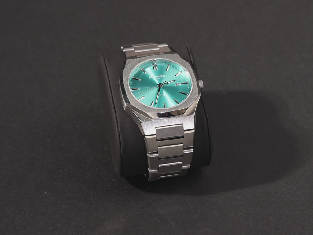 Il distintivo logo De Angelis Milano è inserito nel quadrante, sulla corona, nel fondello e sulla chiusura, testimoniando l'originalità e la raffinatezza di questo orologio.