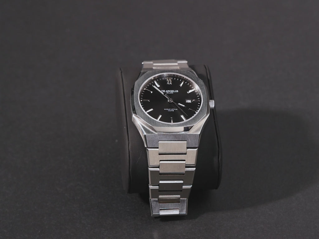Il distintivo logo De Angelis Milano è inserito nel quadrante, sulla corona, nel fondello e sulla chiusura, testimoniando l'originalità e la raffinatezza di questo orologio.